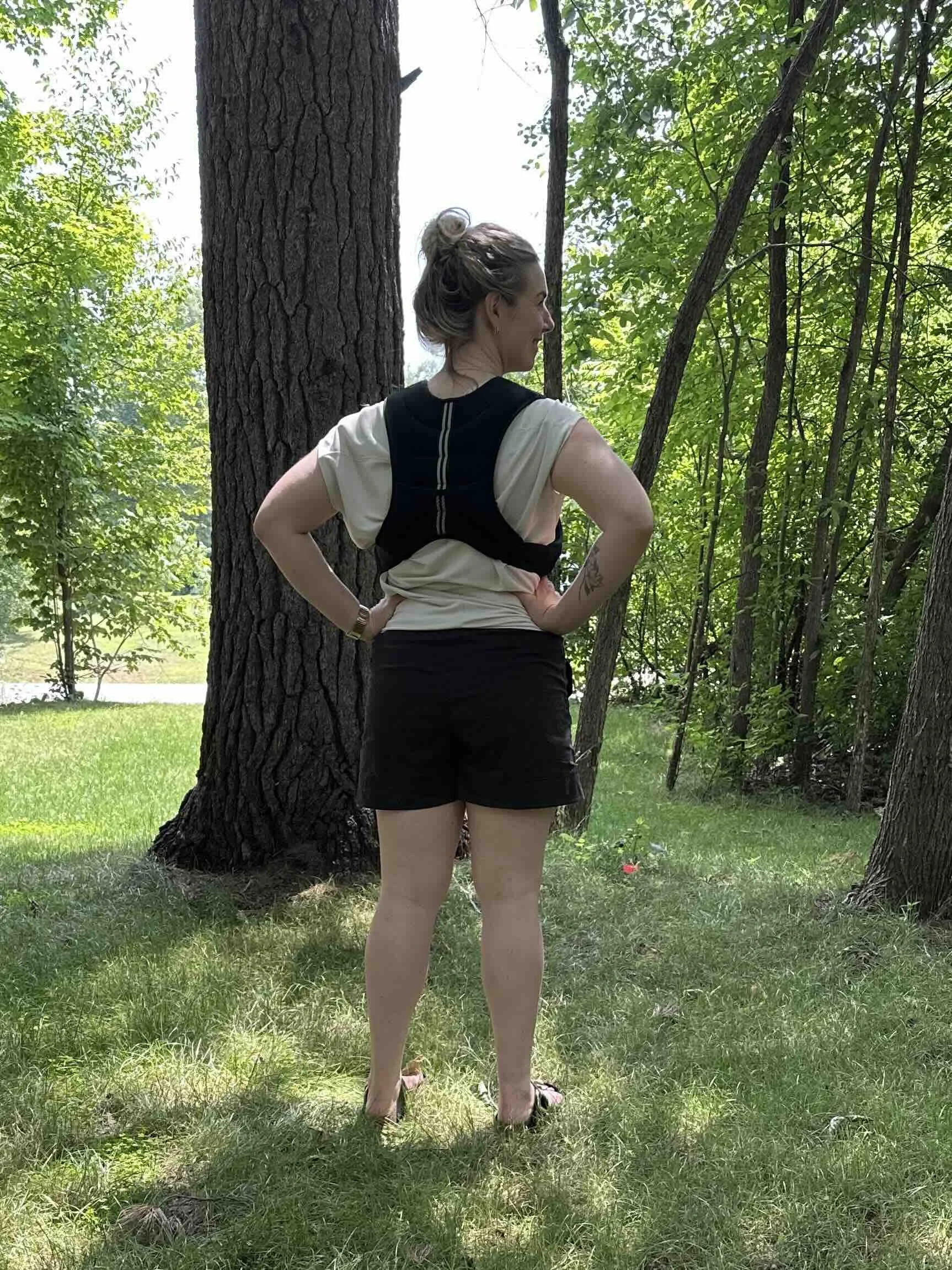 My husband has often said, “When you love something, you really go for it,” which proved true about weighted vest walking as well. One week into owning my first vest, I promptly ordered a second one that could scale to 44 pounds. The 20 lb vest (pictured here; photographed by my 8-year-old) goes on like a backpack; the 44 lb vest goes over your head and looks far more tactical.